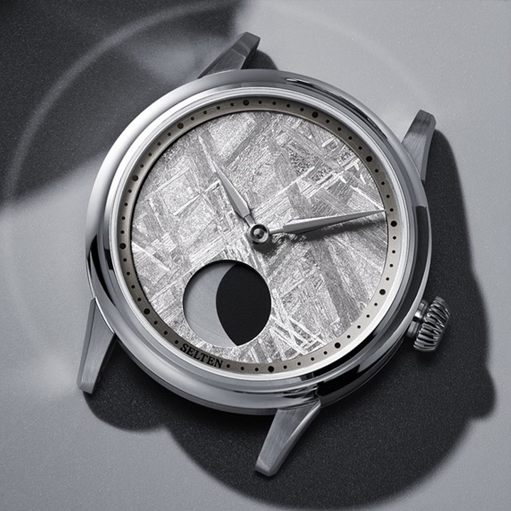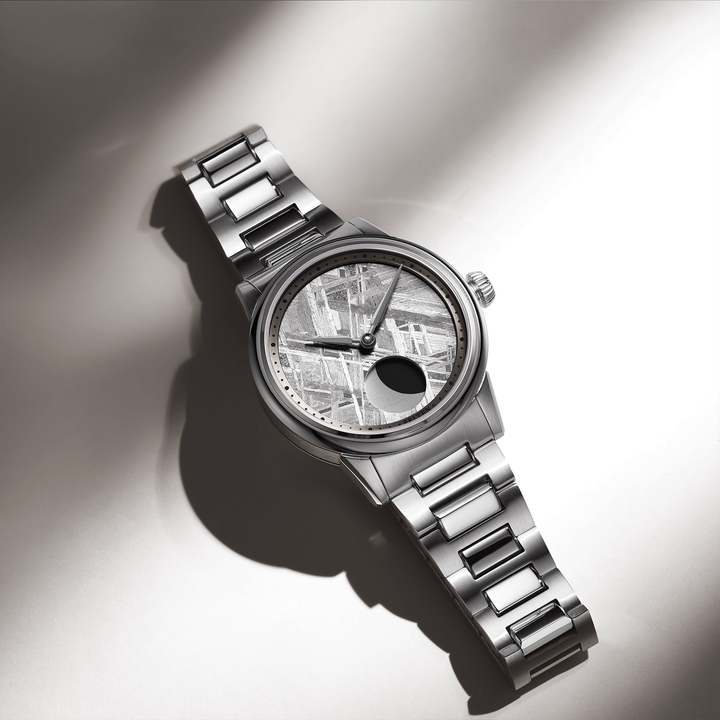 The Muonionalusta Meteorite dial is a mesmerizing blend of cosmic allure and timeless elegance. Paired with a captivating moon phase complication, this watch beautifully showcases the lunar cycle. It's an exquisite choice for those enchanted by the wonders of space and the artistry of fine watchmaking.