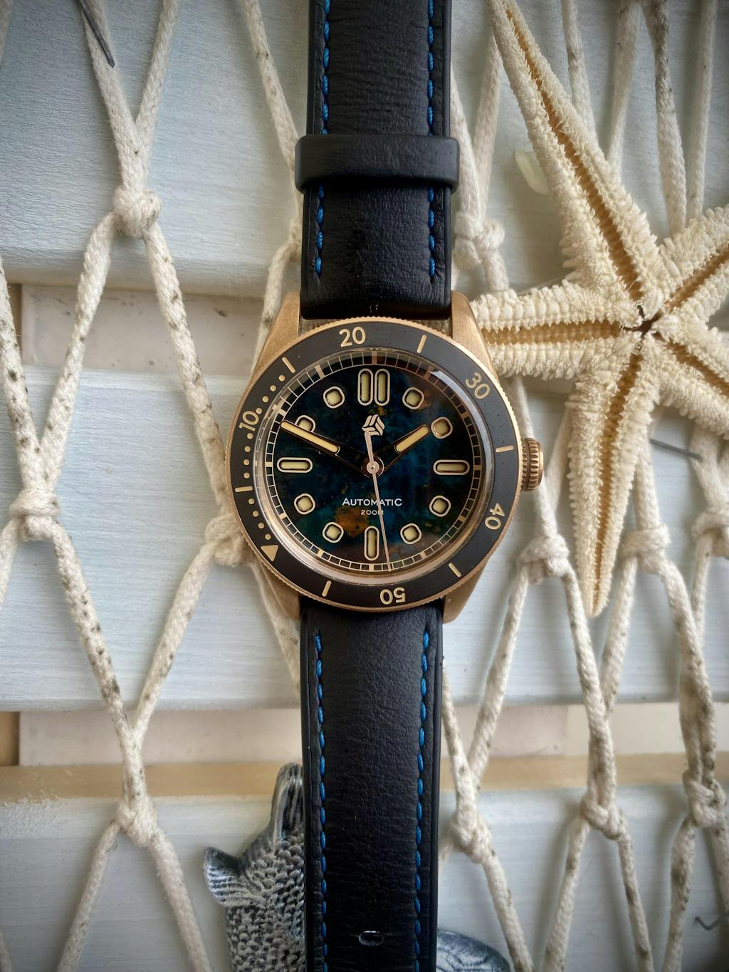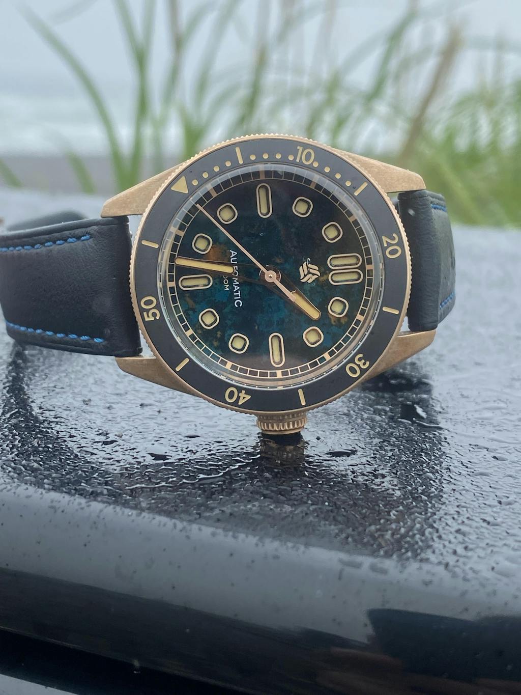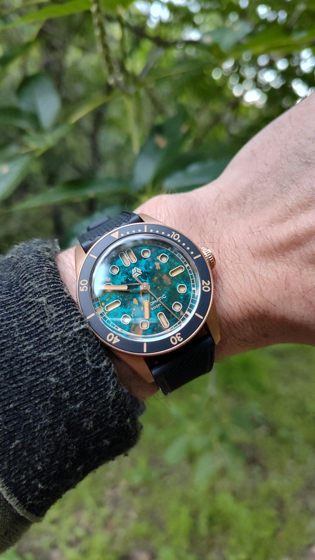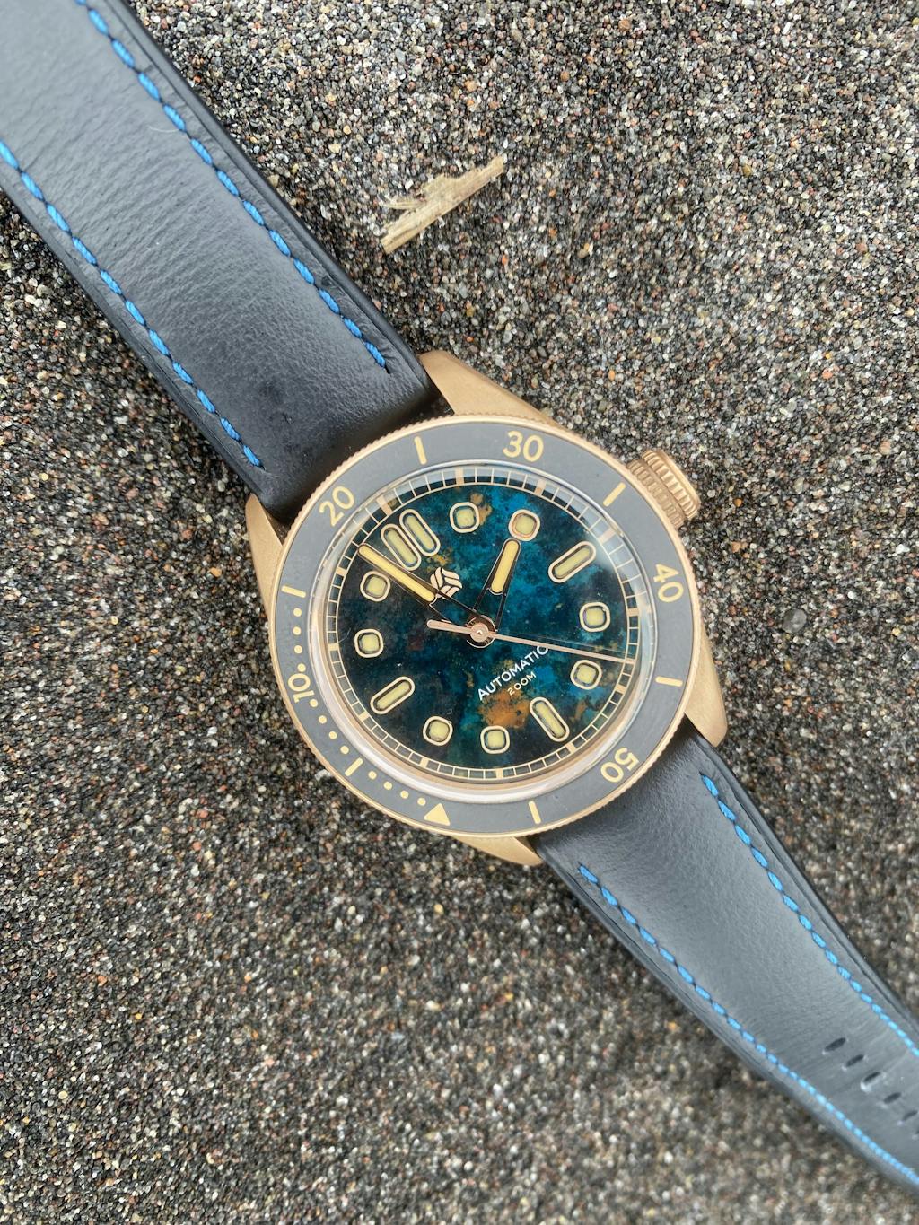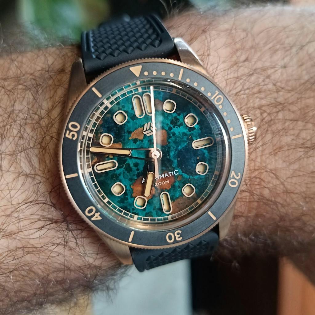 I had been looking at bronze watches and videos on youtube for a while. The first couple I had seen were nice but not quite what I was looking for. I knew I wanted a box crystal, around a 40mm size, and a rotating bezel to frame the dial. But, I also wanted a unique dial. This watch from Selten checked all the boxes! The bronze dial in blue has so much character and the recessed lume is something no other watch I own has. It was the right size and not to thick. It was a fantastic choice by Selten to use a lighter yellow for the lume as it looks vintage and goes very well with the bezel colors and the bronze. The screw down crown operates flawlessly. There is no metal on metal noise from the rotor (common on some of the other japanese auto's) which makes their choice in movement good. The caseback is really detailed as well and I really like it. Although I am personally not a big fan of rubber type straps, it too is comfortable and looks great but, I still opted to purchase a leather strap. Overall, this watch kills it! Selten, amazing job! I look forward to seeing your future releases. 😎😎😎